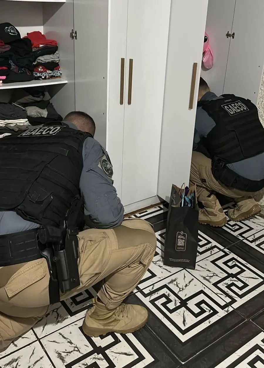 Foram cumpridos cinco mandados de busca domiciliar no litoral do estado, com apoio do Grupamento de Motos da 1.ª Companhia do 9º Batalhão de Polícia Militar (1º BPM).