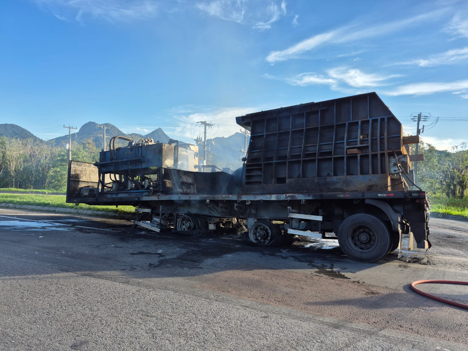 O fogo destruiu a carreta e o equipamento que estava sendo transportado. O motorista não ficou ferido.